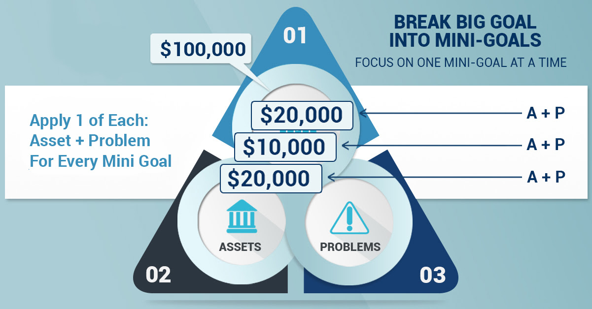 Steve brings down his mini-GOAL ($20,000), his PROBLEM (Motivation) and matches it with an ASSET (Overtime).