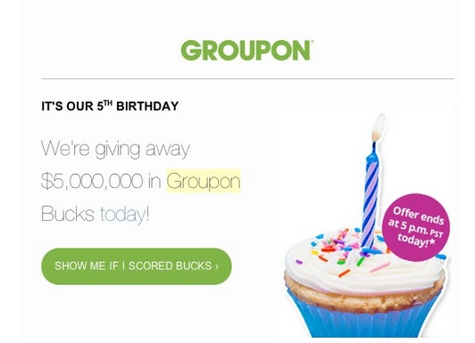 When Groupon celebrated their fifth birthday, they sent out an email marketing promotion to their subscribers. Here’s what they did right, wrong and what you can learn from it: